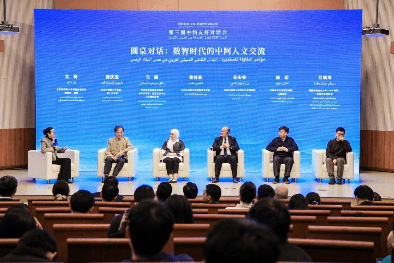 在圆桌对话环节,北外阿拉伯学院副院长、教授尤梅,阿拉伯学院教授、博士生导师薛庆国,约旦汉学家理事会成员、青年汉学家马娜·阿卜杜拉-迪夫·卡玛什,CGTN阿拉伯语国际频道记者鲁特菲(阿尔及利亚籍),阿拉伯学院教师任宏智,捷通华声公司副总经理、总架构师陈明,国投投资企业APC CEO助理、董事会秘书助理艾瑞海等中外嘉宾,围绕“数智时代的中阿人文交流”这一主题进行深入探讨,分享了他们借助新技术、新平台,开展中约、中阿人文交流工作的实践成果与思考。