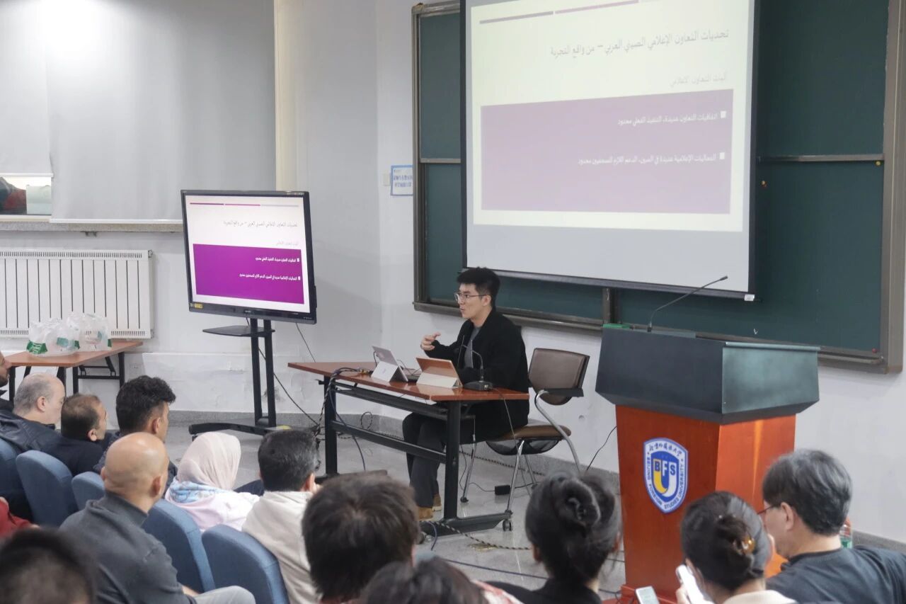 我院博士研究生王嘉轩结合个人经验,立足于新时代中阿国际交流大背景,从多个角度入手,分享了媒体在跨文化交流中的实践经验,并对未来中阿文明交流进行了展望。