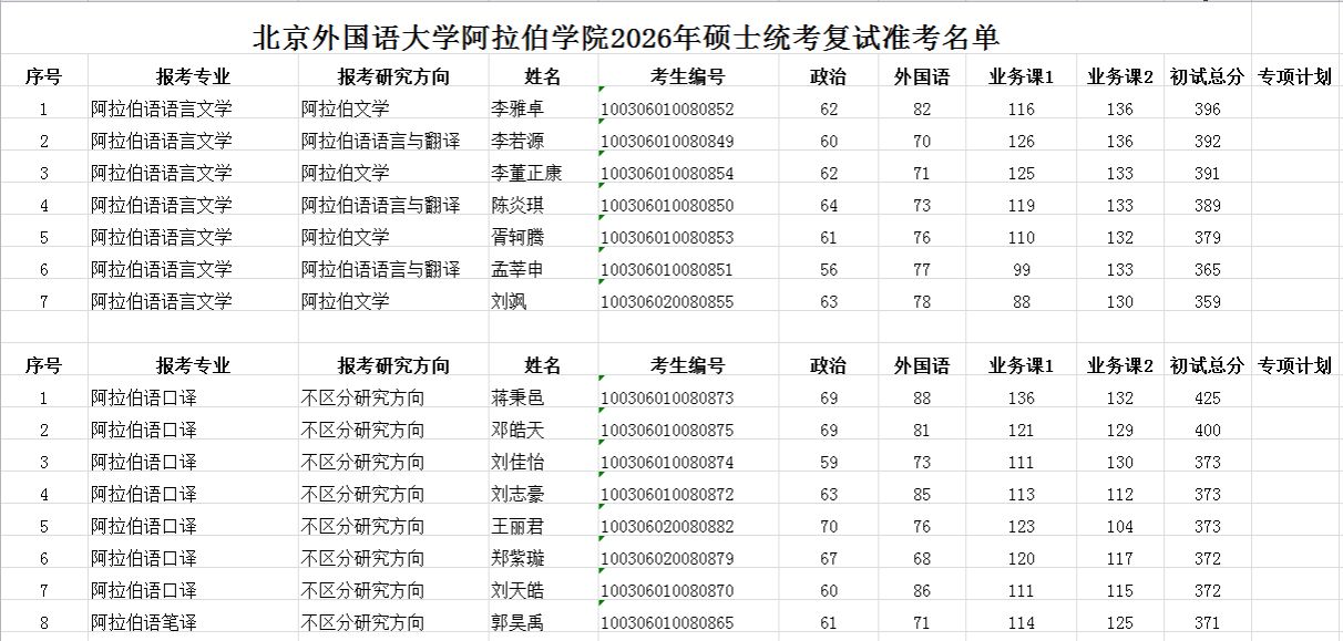 北京外国语大学阿拉伯学院2026年硕士统考复试准考名单
